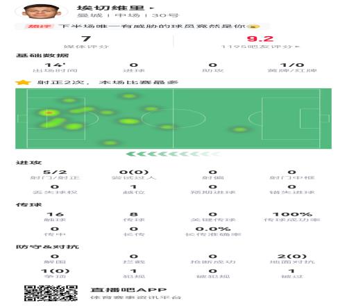 在有限的出场时间里,埃切维里表现抢眼,5次射门2次射正。